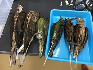 自己紹介のあと、2グループに分かれヤマシギ、サシバ、ズアカアオバトの標本を用いて、鳥の顔(目の位置、くちばしの形、鼻、耳の場所)を触りながら観察しました。グループ内で発見したことを児童たちから引き出し、じっくり観察すると鳥にも鼻や耳があることが発見でき、人間と鳥の違いを知る事ができました。