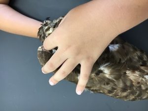つぎに鳥の羽に注目し、『羽毛』『風切り羽』『尾羽』を触り比べそれぞれの羽の役割について解説しました。そのほかに動物の毛皮や爬虫類の皮なども触り比べました。
