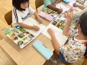 その後、沖縄の自然環境の絵に生きものカードを貼り付けマップを完成させる『生きものマップ作り』をやってもらいました。生きものカードに書かれた特徴をよく読み、どのような環境でどのような生きものが暮らしているのか考えながらマップを完成させることができ、最後に外来種についても触れ講座を修了しました。