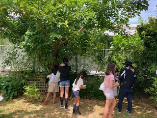 はじめに、環境にやさしいエコバッグ作りをテーマに、材料となる葉っぱを調達するため、そして自然に五感で触れるネイチャービンゴを行うため、自然散策に出発しました。児童たちは自然を使ったビンゴに興味津々で、草やトンボ、つるつるしたものなど、五感をフル活用してすぐにお題を見つけていました。
