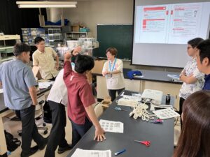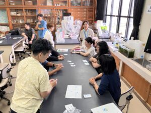 続いて、「防災カードゲーム」を紹介し、教育現場での活用を想定して実際にグループワークで体験しました。さらに、災害時に役立つロープワークや、電気が使えない状況でもご飯が炊ける「防災メシ」の調理体験、災害時に用いる「ダンボールトイレ作り」も行いました。