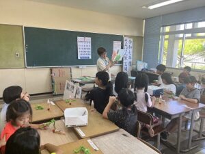 講座は、絵本を使ってごみが資源として生まれ変わる仕組みを解説することから始まりました。「変身!」の掛け声で参加を促すと、にぎやかな児童たちは楽しみながらリサイクルについて学んでいました。ペットボトルからリサイクルされた風呂敷やネクタイ、ボールペンを実際に手に取ってもらい、硬いペットボトルが柔らかい布に変わることを体感してもらいました。