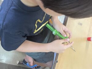続いて、リサイクル体験工作として「ペーパービーズ作り」を行いました。今回は、職場実習中の大学生3名と先生方の手厚いサポートもあり、スムーズに作業を進めることができました。児童たちは友達同士で相談したり、手伝ったり教え合ったりしながら、熱心にビーズ作りに取り組み、苦戦する場面もありましたが、みんなで協力してブレスレットを完成させました。