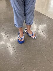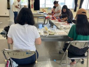 その後、参加者には持参してもらったTシャツを5cmほどの幅にカットしてもらい、布ぞうり作りを開始しました。PPロープを組む工程や編み始めは複雑で、苦戦する参加者も多く見られましたが、その工程を終えるとスムーズに編み進めることができました。編み終えた後は鼻緒用の布にPPロープを通し、それぞれの足の大きさに合わせて鼻緒を取り付けました。休憩を挟みながら、約3時間かけて1足の布ぞうりが完成しました。