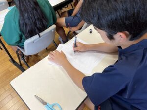 はじめに、A4用紙を地球上のすべての水の総量に見立て、その中でどのくらいの面積が生活用水として利用できるのか考える作業を行いました。この作業を通して、地球上の水のほとんどが海や湖など生活用水として利用できない水であること、そして利用できる水はごくわずかであることを視覚的に認識することができました。