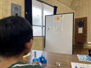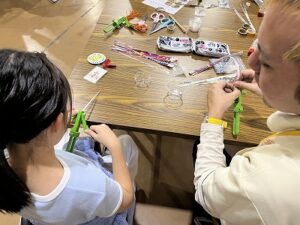あわせて、手回し発電機で作った水素エネルギーで飛ばす「ミニロケット」の的当てゲームも実施しました。クリーンエネルギーの仕組みを体験できるこの教材は子どもたちに大人気で、ペーパービーズ作りを終えた子が次はロケットに並ぶなど、多くの親子が長時間ブースに滞在して環境学習に取り組んでいました。