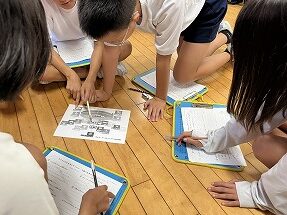 はじめに、航空写真を用いてはごろも小学校周辺の環境について確認しました。