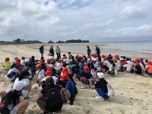 ビーチ到着、はじめにクラス毎に15分程時間を使ってゴミ拾いを実施。ビーチ側よりも