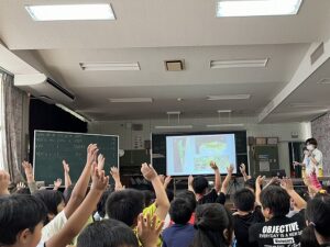 生き物クイズでは、身近な生き物を紹介し名前当てクイズをしました。写真の中から隠れた生き物を探すクイズでは、早く見つけた児童にどこにいたのか発表してもらうなどし、最後に特定外来生物の問題を紹介して講座を修了しました。