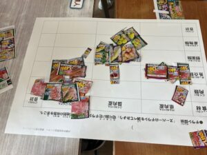 次に、世界地図に切り分けたチラシを貼り、どの商品がどのくらい遠くから輸入されているのか