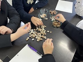 などを確認しながら、タニシとマイマイの違いについて説明。その後、カタツムリの殻を分類する