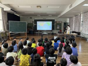 2年生では「沖縄の自然や生き物」をテーマにした講座を実施。世界地図から沖縄の位置を確認し、沖縄の地図から小学校までズームをして、小学校の周りに海や川や森があることを確認しました。沖縄の自然として、海、サンゴ礁、マングローブ林、森、ヤンバルなどを紹介し、琉球列島は160個の島があることを確認しました。